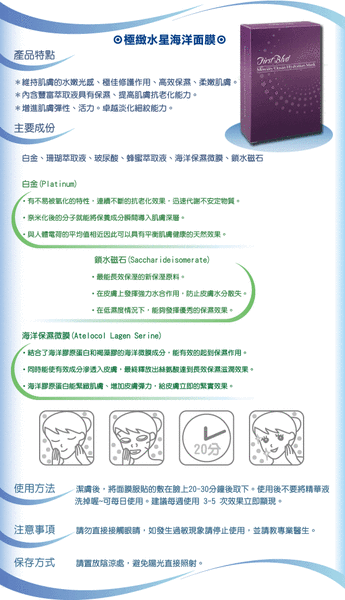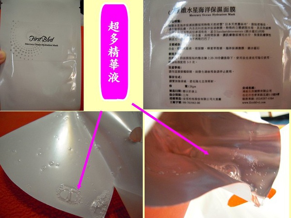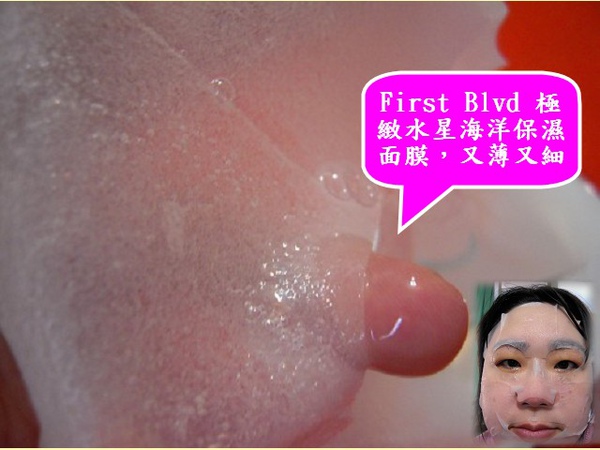所以我從秋末就開始”挫勒等”,好在這次搶先一步體驗First Blvd 極緻水星海洋保濕面膜,才讓我的臉到現在還抵的住寒風(一週2-3次,視皮膚狀況而定,我已用掉十片囉!)。打開包裝先聞到的是淡雅的花香,味道非常淡,淡到敷在臉上也可以忽略它完全不會造成不適,裡面的布膜跟俗稱的蠶絲布膜相近,都是屬於薄又軟讓我們的皮膚能增加吸收速度,用在臉上那細緻的布膜一點也不會傷害皮膚,另外拿的時候要小心,粗手粗腳的妦第一次用很豪邁的使用結果就拉扯到了。