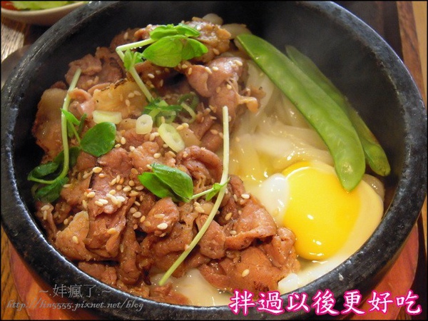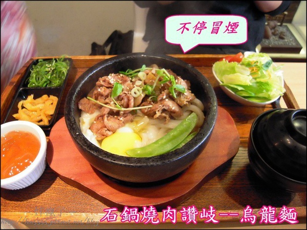 另一個人氣商品「石鍋燒肉讚岐」有飯跟烏龍麵可以選,也是服務人員建議我們搭配烏龍麵來享用,那QQ粗粗彈牙的烏龍麵,透過石鍋嗆煙的熱氣,佐以下飯重口味的燒肉,兩者交互相拌,連坐對面的我也聞到香氣,在我的「腰內肉」還沒上桌前有一跳想跳槽去吃。