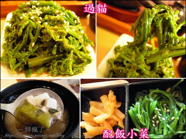 沒想到店內還有來自花蓮產地直送的「過貓」,過貓是一種低卡高纖的野菜,咬起來爽脆感佳。定食搭配的小菜也意外的受到我們喜愛,尤其是海帶受到我們一致的喜愛,隨餐附上的果凍,壓下去也是緊密度佳,而非像某些餐館,只是來充數的。