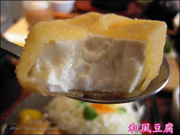 「和風豆腐」四角挺立,看起來有厚度扎實感,果不其然用筷子夾起會軟嫩嫩的像快滑開似的。裡頭包著的嫩豆腐,水嫩Q彈絲毫不受油炸的影響。