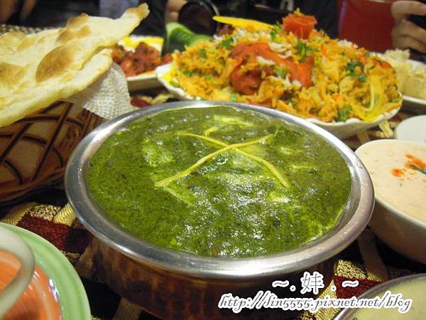 重頭料理:菠菜白酪。四斤的牛奶只能製成250克的白酪,再將白酪與菠菜混煮而成,除了可以搭配餅皮包裹在一起吃外,還可以將其沾在印度米上頭。吃印度料理真是超適合妦的,我喜歡每一個沾一點,有點制式卻又不受拘束吃法,印度料理便是如此。