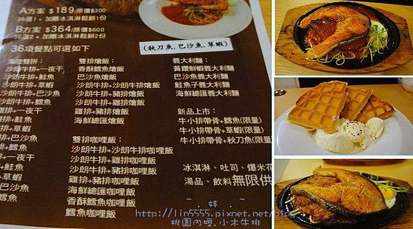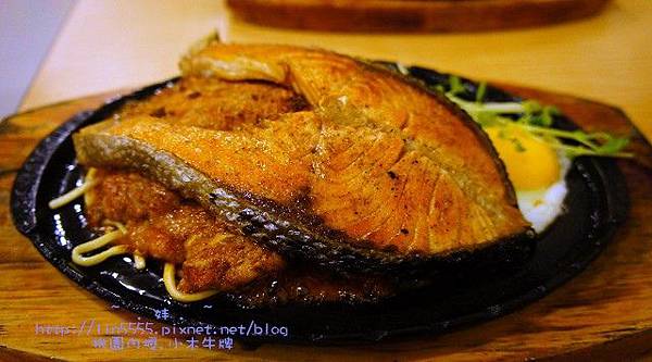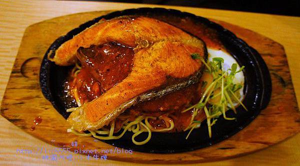 兩份雙主餐:1鮭魚+雞排;2鮭魚+豬排。仔細看鮭魚超大片,雞豬肉亦不小,煎的過油鐵盤底部會剩油。會這麼點主因是老爺不吃牛,加上前一次前往鮭魚已賣完,妦實在很想知道:是店家根本沒準備還是真的售完。這次點下去才發現:真的有鮭魚耶!最後兩客被我們點走了。