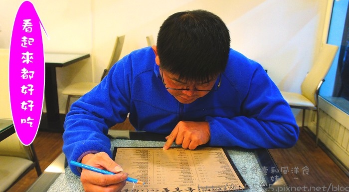 簡單半自助式用餐環境,到櫃台拿菜單後再到櫃台埋單,接下來餐點送上桌,其他自己來。用餐前哈尼尼一直跟妦說不餓,今晚吃精巧。哪知一看到菜單菜色竟直呼:每個看起來都好好吃喔,我可以點兩個嗎?不用,你點兩個,我吃半個就好。