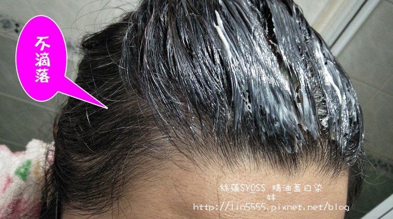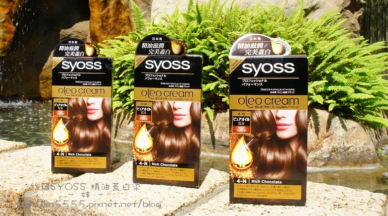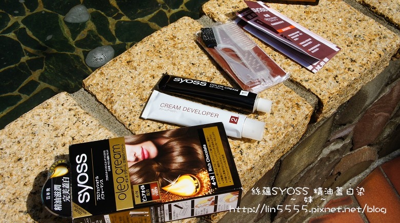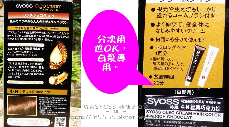 這一回我用的是沙龍級染髮配方【絲蘊SYOSS精油蓋白染4N經典巧克力棕】,它精油添加主打完美遮蓋白髮,我白髮多多,因此選的色系相對深重,但不是黑色的喔!染黑的會超不自然。