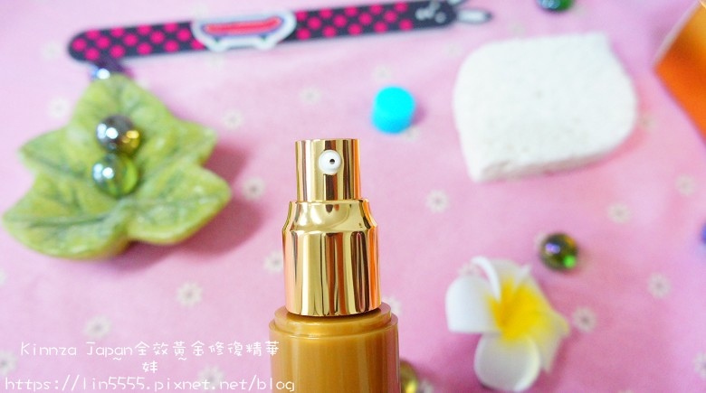 Kinnza Japan日本金座一瓶50ml,按壓瓶設計,初次使用時記得要多按壓5-10下,味道超級迷你淡,得整個湊近瓶身才有聞香氣,呈現米白色乳水狀,像米糠水的顏色。它添加復活草萃取讓小金瓶達到超強保濕效果;除此之外還有黃金成份讓皮膚更好吸收、亮澤。保濕做好了自然淡化細紋、亮白。