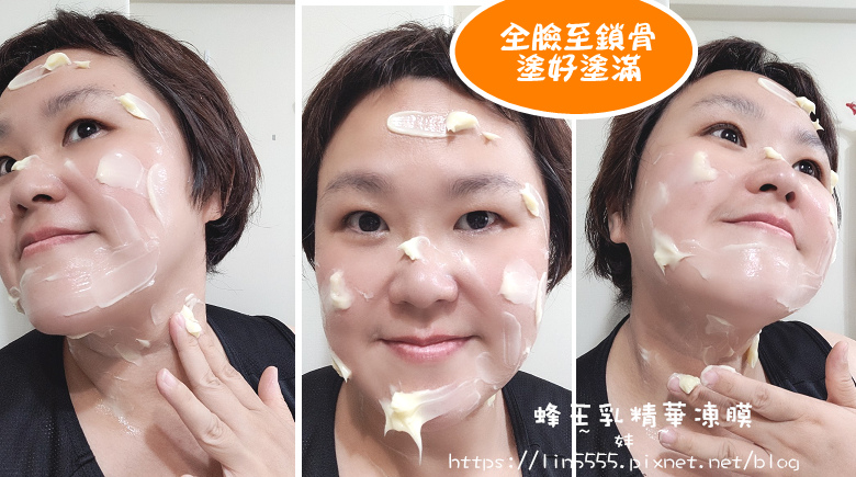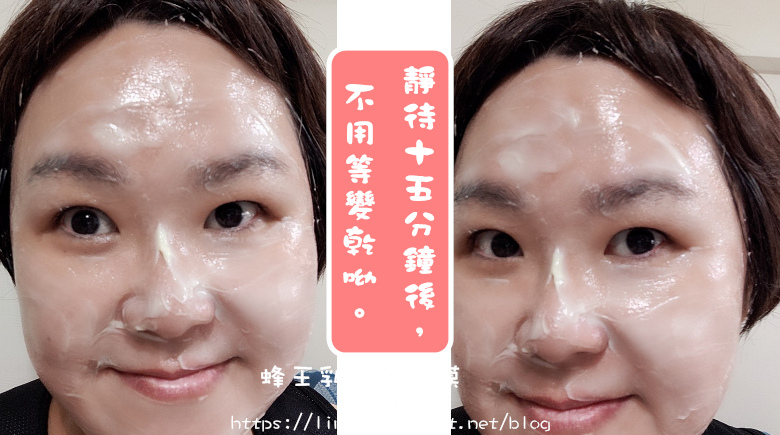 全臉塗好塗滿後,記得延申到脖子、鎖骨才不會讓它們不小心洩齡囉!靜待15-20分鐘,等待的過程中專利奇蹟補水因子,會滲透肌底,逐層釋放水精華,讓肌膚摸起來Q彈活力。嘿,千萬別傻傻的等它乾呦,時間到了即可以用水沖洗、擦拭後再上平日保養即可。
