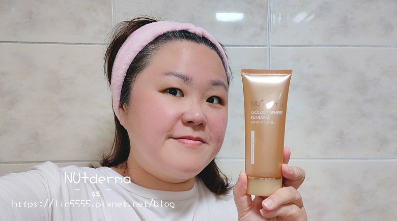 迫不及待的使用極細膩含有熊果素的NU+derma【亮采金球去角質凝膠】沒有粗粗的顆粒感,不會有像菜瓜布在協助清出老舊廢物感受。裡頭還有維他命E晶球添加,邊推邊搓金球奢華尊榮感油然而升。